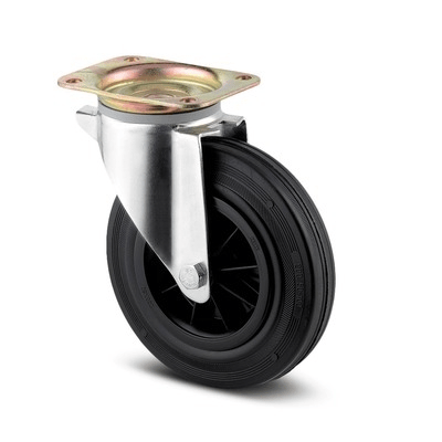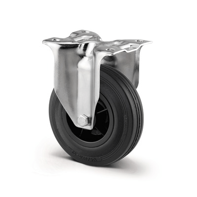 Rolă fixă, Furcă din tablă din oţel, ambutisată, zincată, axul roţii cu şurub şi piuliţă, sistem de prindere tip placă. Jantă din poliamidă suprafaţă de rulare din poliuretan, rulment cu colivie cu ace