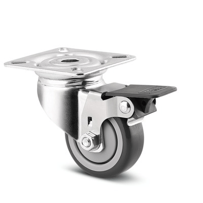 Role pivotante cu blocare pe roată, furcă din oţel inoxidabil, bile pe două rânduri, axul roţii cu şurub şi piuliţă, pedală de blocare din poliamidă, alezaj pentru ax. Jantă din polipropilenă, suprafaţă de rulare din cauciuc gri tip TENTEprene (cauciuc termoplastic), non-marking, rulment plan (bucşă antifricţiune)