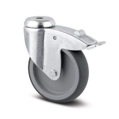 Roată pivotantă, furcă din oţel inoxidabil, bile pe două rânduri, axul roţii cu şurub şi piuliţă, alezaj pentru ax. Roată din poliamidă, rulment plan (bucşă antifricţiune)